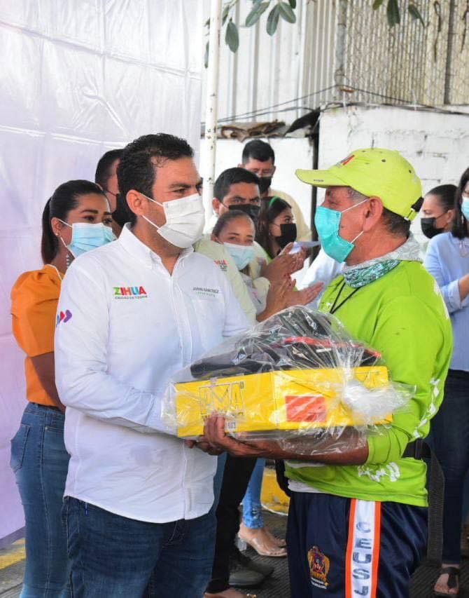 El presidente Jorge Sánchez Allec, acompañado de su esposa Lizette Tapia Castro e integrantes del Cabildo, encabezó la entrega de uniformes completos a los 460 trabajadores de todas las áreas de la dirección de Servicios Públicos, a quienes les hizo un reconocimiento público por el esfuerzo desplegado diariamente para mantener a Zihuatanejo con una imagen de limpieza que cautiva a los visitantes nacionales y extranjeros.