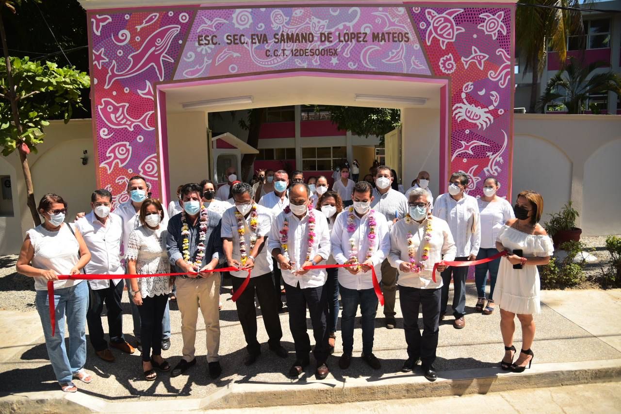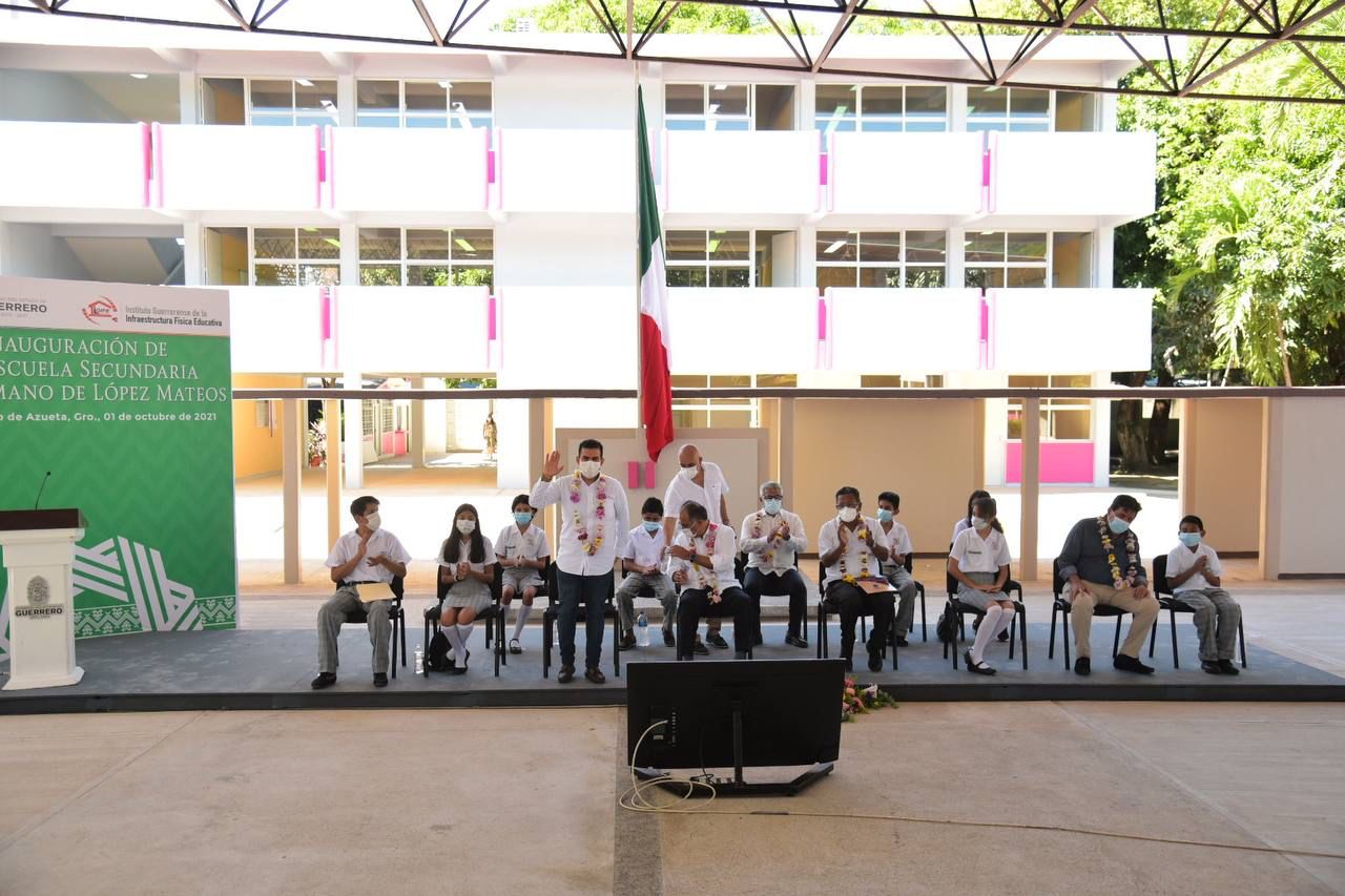Zihuatanejo, Gro., 03 de octubre de 2021.- En el segundo día de su periodo adicional de gobierno 2021-2024 y al acompañar  al gobernador del estado, Héctor Astudillo Flores, en el acto inaugural de un nuevo edificio construido para la escuela secundaria general Eva Sámano de López Mateos,  el presidente Jorge Sánchez Allec refrendó su compromiso con el sector educativo en el municipio al ofrecer que hará la gestión necesaria para apoyar el mejoramiento de las instalaciones de este plantel.