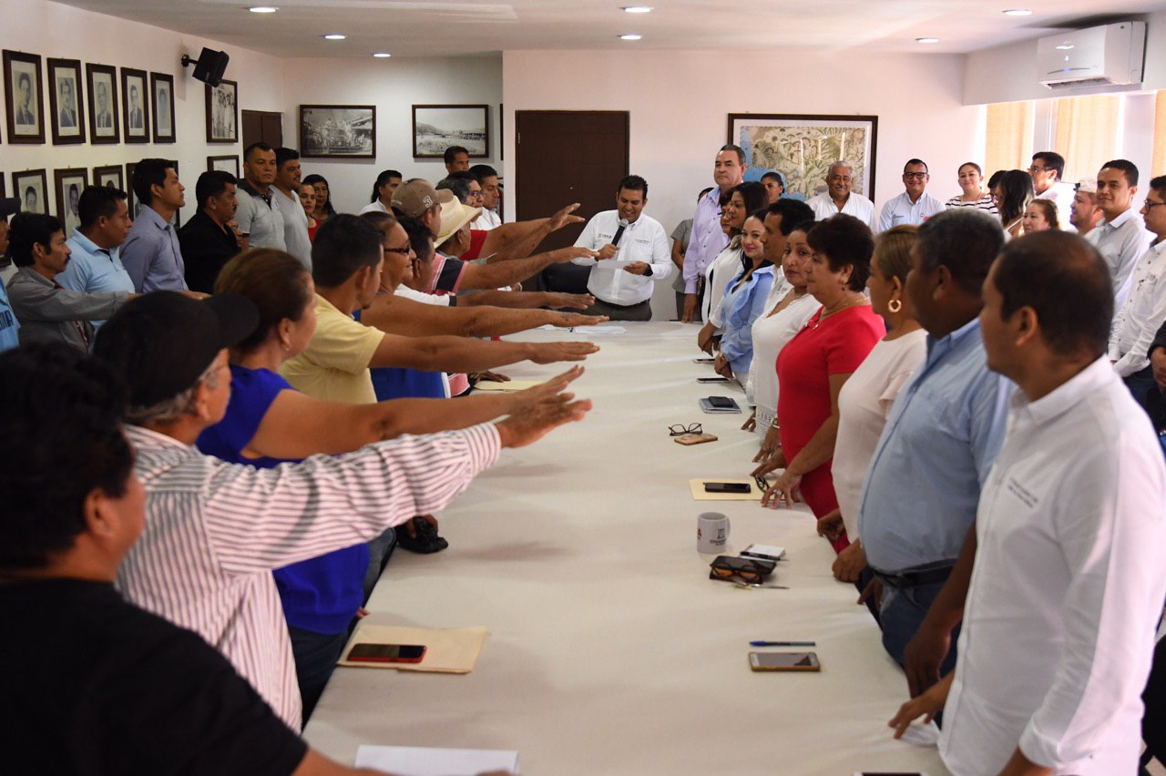 PIE DE FOTO: El presidente Jorge Sánchez Allec tomó protesta a los nuevos comisarios municipales para el periodo 2019-2020 en sala de cabildo, acompañado de síndicos y regidores, el director de Gobernación Amando Vargas Herrera, así como el delegado del gobierno del estado en la Costa Grande, Juvenal Maciel Oregón.