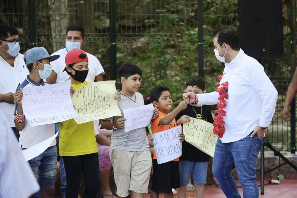 El presidente Jorge Sánchez Allec cumplió el sueño de habitantes de la colonia El Calechoso al entregar la rehabilitación y remodelación del parque recreativo y el ampliación de la red de drenaje sanitario en el andador Brasil ademas dio el banderazo de arranque de ampliación de la electrificación.