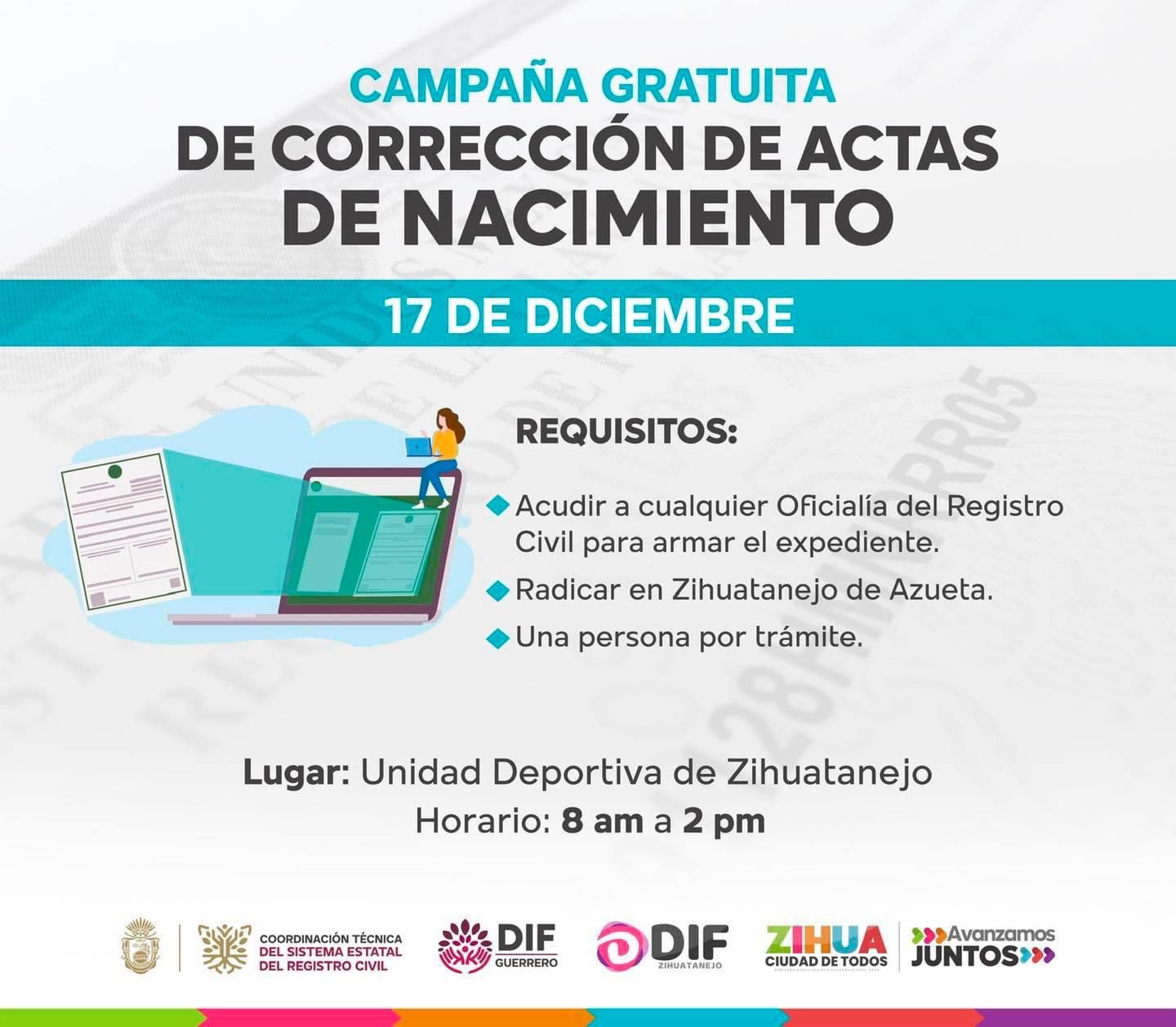Como parte de las acciones de apoyo a la economía de las familias de Zihuatanejo de Azueta, el gobierno que encabeza el presidente Jorge Sánchez Allec, en un esfuerzo conjunto con la Coordinación Técnica del Sistema Estatal del Registro Civil y el DIF Municipal, llevará a cabo este viernes, 17 de diciembre, una campaña gratuita de Corrección de Actas de Nacimiento en las canchas techadas de la Unidad Deportiva, donde desde las 8 de la mañana hasta las dos de la tarde personal de la dirección del Registro Civil, bajo la coordinación del titular de la dependencia, Francisco Gutiérrez Fierro, atenderá a todas las personas que requieran de este servicio.