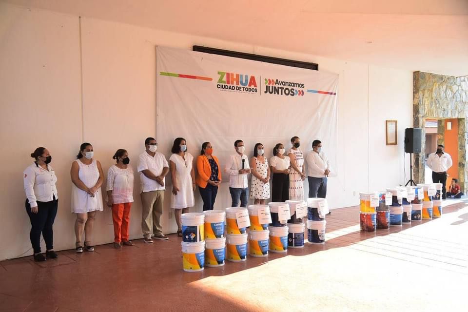 El presidente Jorge Sánchez Allec, acompañado de integrantes de la Comuna, recibió este lunes por parte de la Fundación Merza, representada por la gerente Yanet Hernández Vega, una importante dotación de material de pintura en apoyo de 11 escuelas de nivel básico a medio superior de esta zona de la región Costa Grande, lo que permitirá mejorar la imagen de los planteles educativos beneficiados.