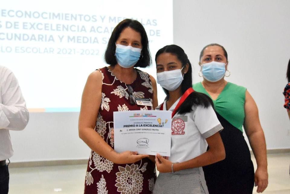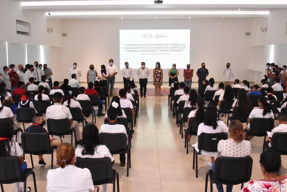 Con la representación oficial del presidente Jorge Sánchez Allec, acompañada de integrantes del Cabildo y autoridades educativas, la primera síndica procuradora, María Guadalupe García David, encabezó este miércoles la entrega de reconocimientos y medallas al mérito académico a un total de 91 alumnos que en el ciclo escolar 2021-2022 concluyeron su instrucción primaria, secundaria y media superior en diferentes planteles del municipio, todos ellos con un promedio de 10 puntos en sus respectivas calificaciones.