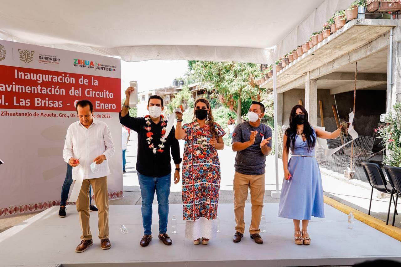 La gobernadora Evelyn Salgado Pineda y el presidente Jorge Sánchez Allec encabezaron el viernes de la semana pasada la inauguración del circuito vial que conecta a las colonias Brisas del Mar y 6 de Enero, una obra de infraestructura que tiene historia en la zona poniente de Zihuatanejo, toda vez que su ejecución se inició con dificultades y para concluir el proyecto fue necesaria una mezcla de recursos de los gobiernos estatal y municipal.