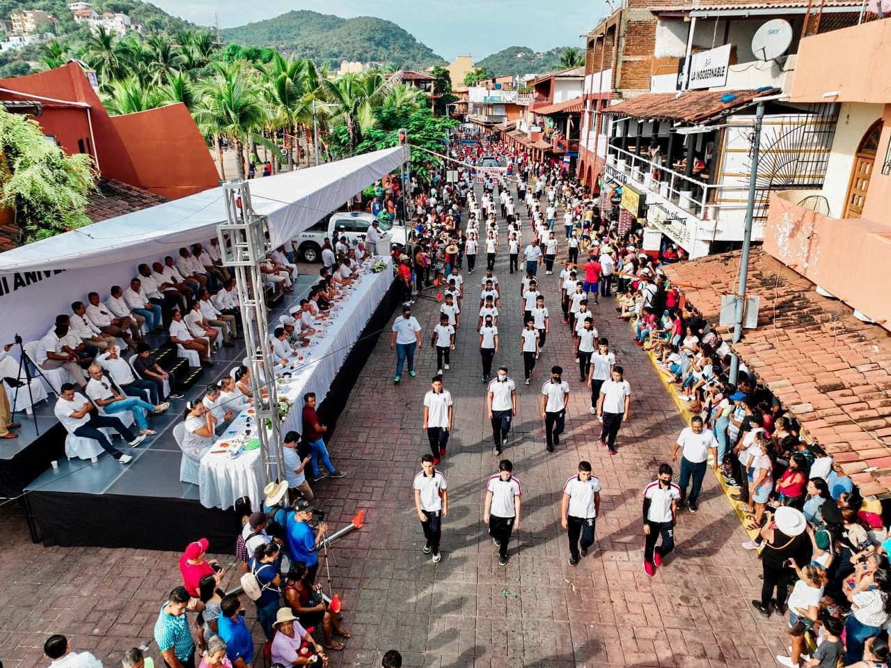 La marcha conmemorativa fue encabezada por la XVI Zona Naval Militar; mientras que la mayoría de los 33 contingentes que dieron un total de dos mil 714 participantes, la integraron estudiantes de instituciones educativas de todos los niveles, quienes con su actuación se ganaron los aplausos de miles de personas que desde tempano salieron a las calles del Centro de Zihuatanejo para disfrutar de uno de los eventos más importante del año en este destino de playa, que también cautivó a turistas nacionales y extranjeros.