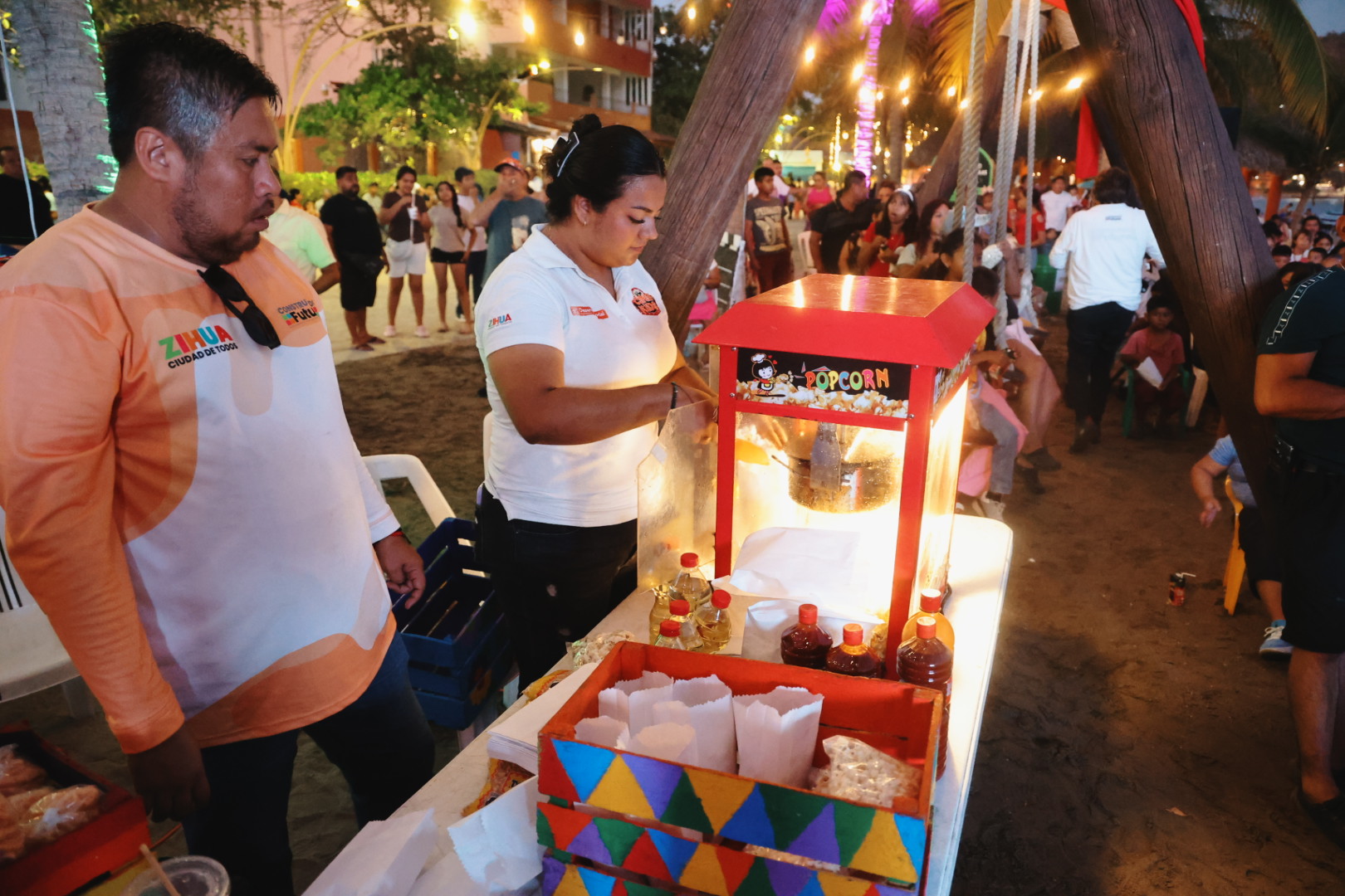 Cumpliendo con el programa planeado para el festival del periodo vacacional de Semana Santa, la presidenta Lizette Tapia Castro, a través de la Dirección de Desarrollo Social y Humano, a cargo de Bernardo Benjamín Sánchez, realizó el evento Cine en la Playa para beneficio y diversión de niñas y niños, tanto locales como visitantes, que están de vacaciones.