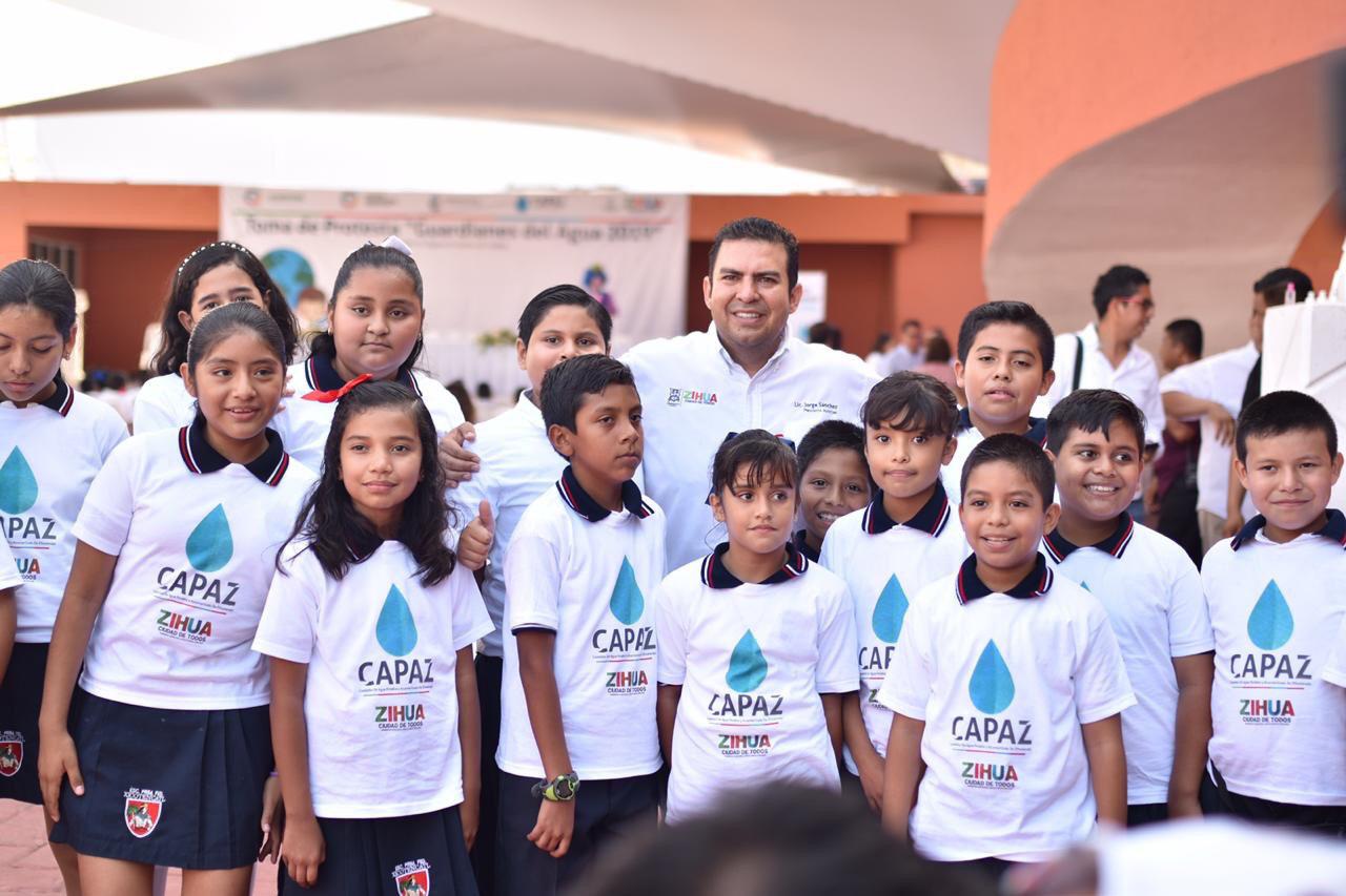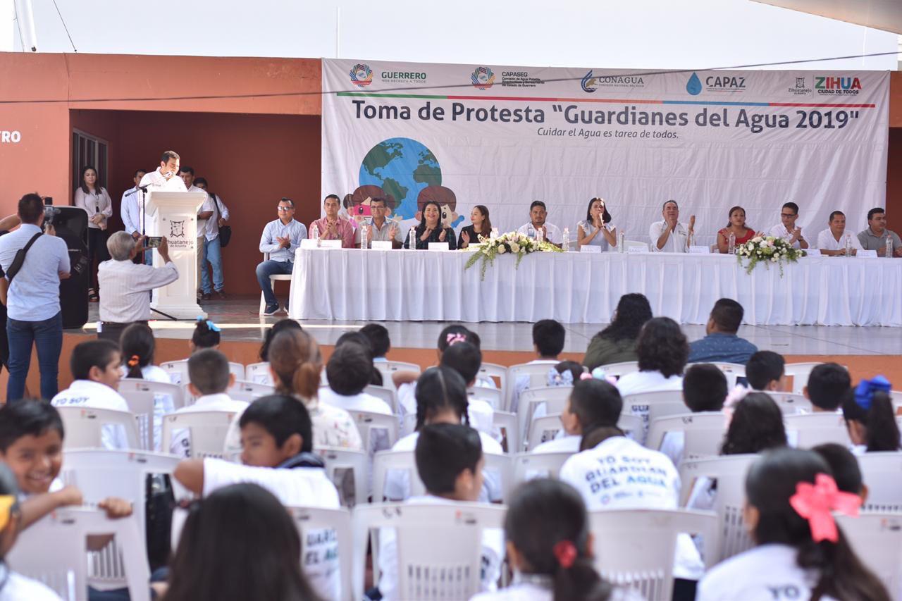 Zihuatanejo.- En el marco de la puesta en marcha del Programa “Te Quiero Zihua” por parte de la administración municipal y con el objetivo de cuidar el agua, así como transmitir el mensaje de conciencia dentro y fuera de las instituciones educativas, el Presidente municipal Jorge Sánchez Allec, tomó protesta a la nueva generación de 140 estudiantes de nivel primaria como “Guardianes del Agua”.