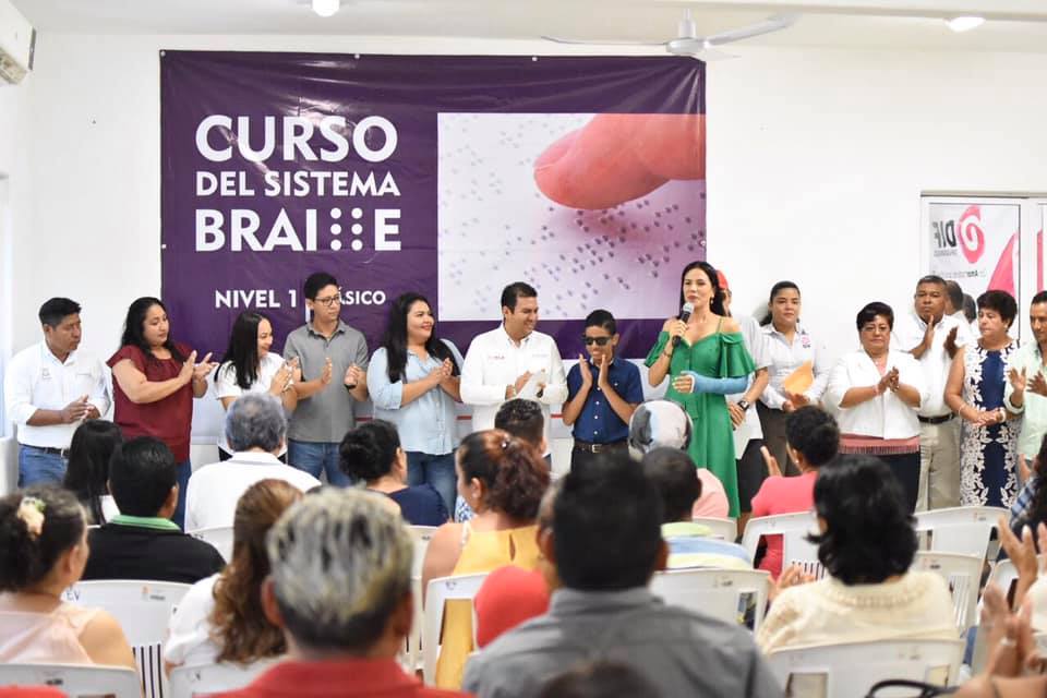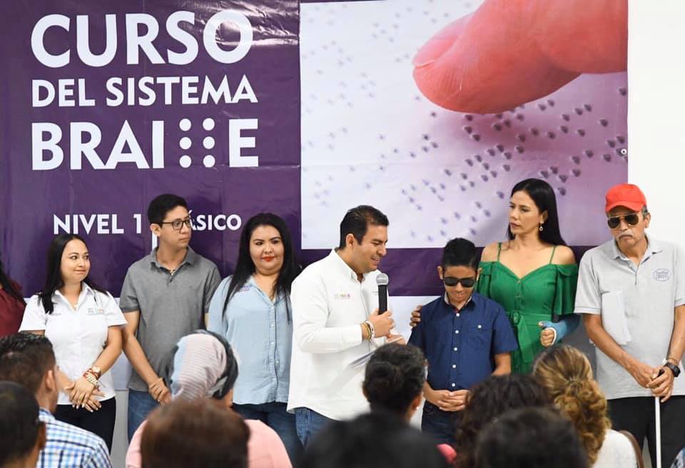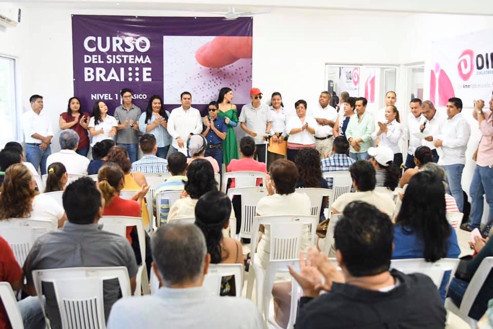 Zihuatanejo, Gro., 15 de octubre de 2019.- En sendos eventos desarrollados este martes, el presidente Jorge Sánchez Allec, junto con su esposa Lizette Tapia Castro, presidenta honoraria del DIF Zihuatanejo; integrantes del Cabildo y directores municipales, inauguró el Curso Básico del Sistema Braille y clausuró el de Uñas Acrílicas, el primero dirigido a personas con discapacidad visual y el segundo en apoyo de mujeres que buscan la superación personal y el bienestar familiar.