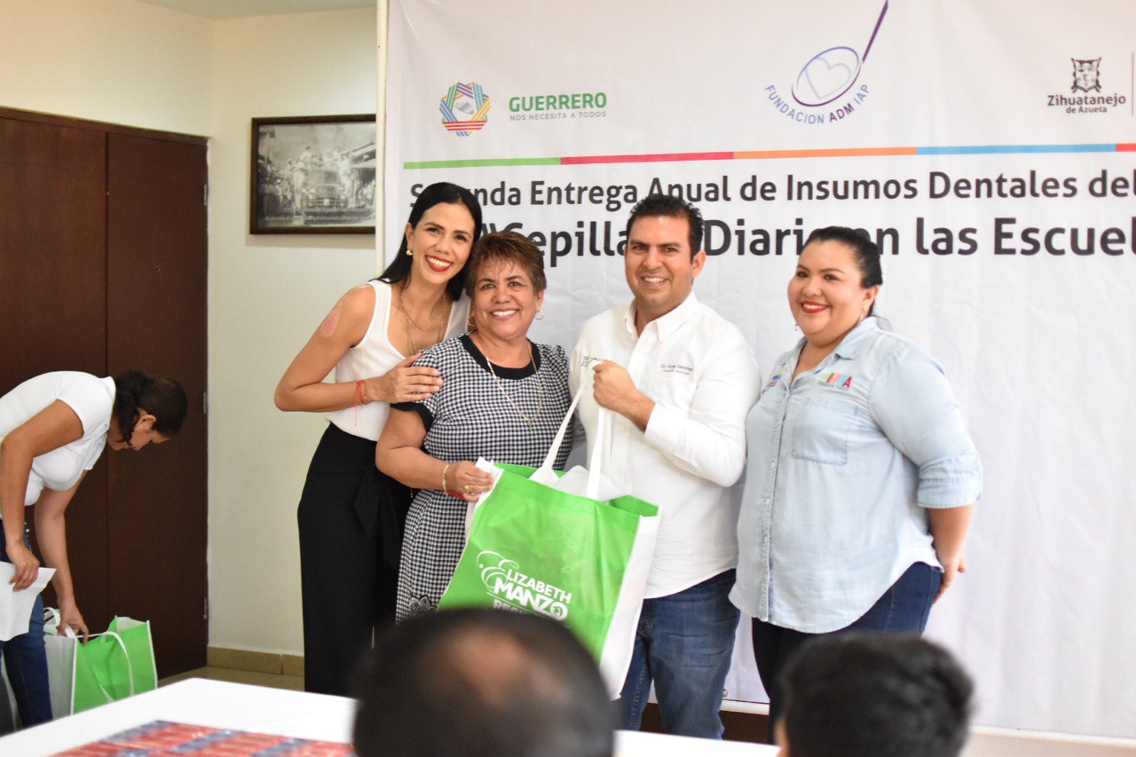 Zihuatanejo, Gro., 12 de noviembre de 2019.- El presidente Jorge Sánchez Allec, acompañado de su esposa Lizette Tapia Castro, la regidora de Salud y Juventud Nieves Elizabeth Manzo Nava y funcionarios de la administración municipal, hizo este martes la segunda entrega anual de insumos dentales del programa “Cepillado Diario en las Escuelas”, consistentes en 2500 kids (cepillos y pastas) que igual número de alumnos de 14 planteles de la zona utilizarán en el cuidado de su salud bucal.