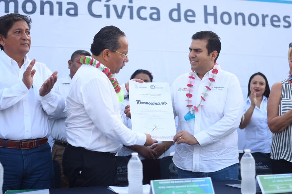 Zihuatanejo, Gro., 2 de diciembre de 2019.- El Director General del Colegio de Bachilleres en Guerrero, Fermín Gerardo Alvarado Arroyo, le entregó este lunes un reconocimiento al presidente Jorge Sánchez Allec por aportar recursos económicos y materiales para mejorar la infraestructura de los planteles de dicho sistema educativo en Zihuatanejo de Azueta y propiciar con ello que la población estudiantil pueda desarrollar sus actividades de aprendizaje en espacios con mayor comodidad.