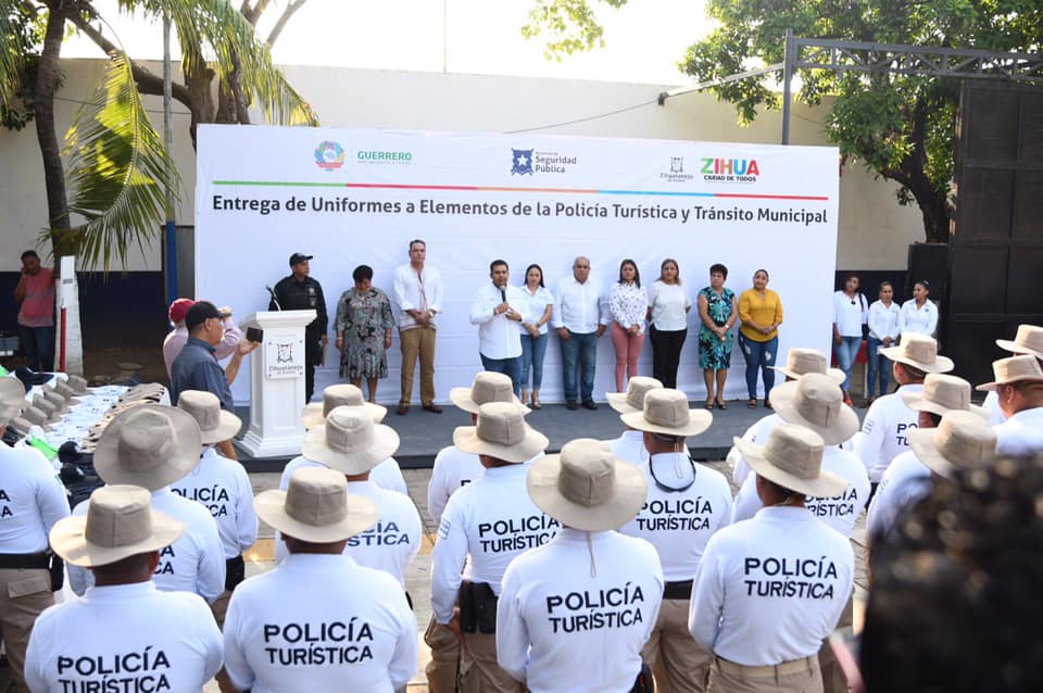 Zihuatanejo, Gro., 6 de diciembre de 2019.- Al encabezar este viernes la entrega de uniformes completos a elementos de las policías Turística y Vial (Tránsito) del municipio, el presidente Jorge Sánchez Allec reconoció el buen desempeño que han tenido los más de 80 efectivos de ambos grupos de la dirección de Seguridad Pública, y anunció que a principios del año próximo todos ellos recibirán un bono de productividad que se han ganado con el trabajo que realizan todos los días a favor de los visitantes nacionales y extranjeros.