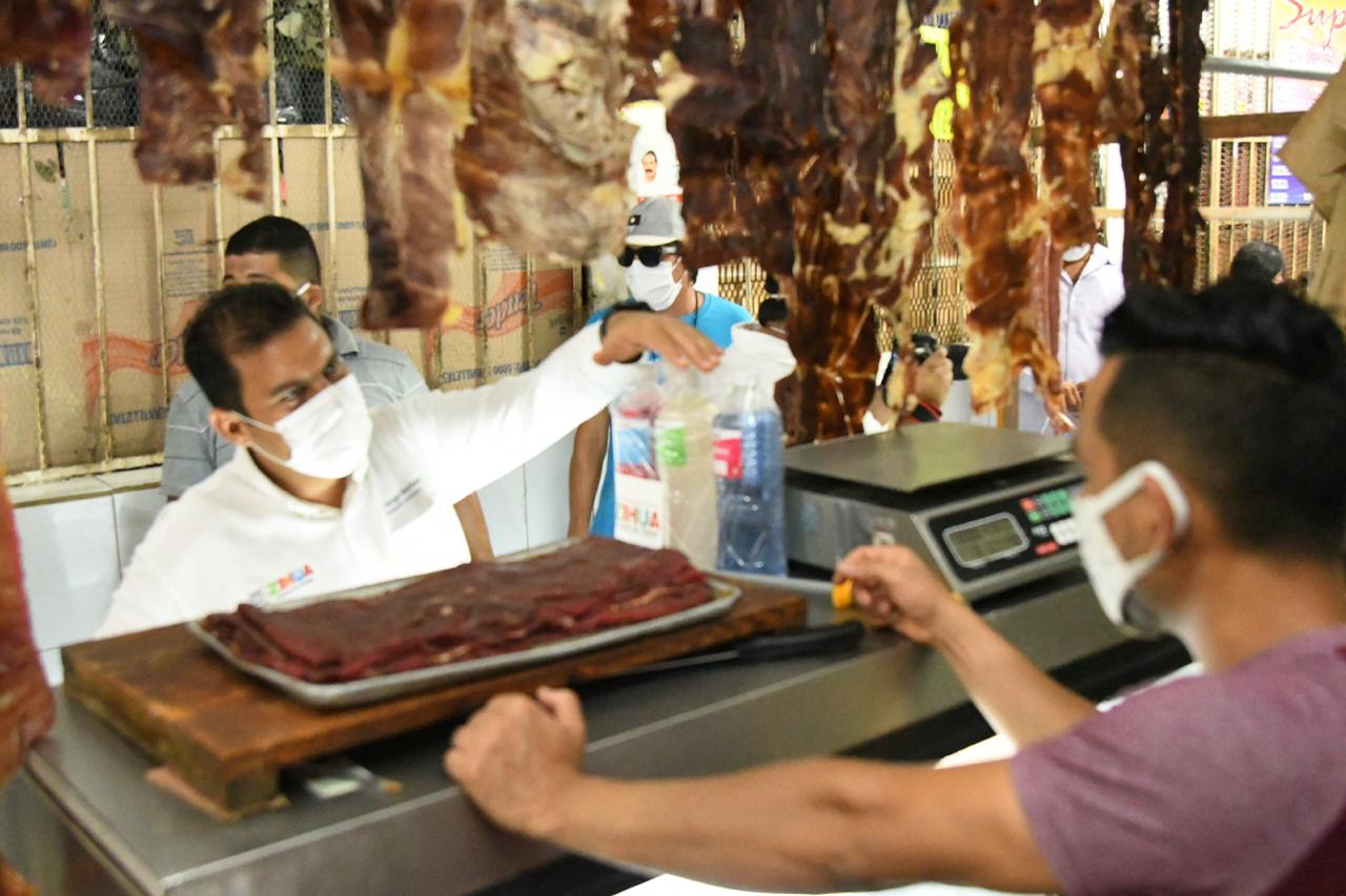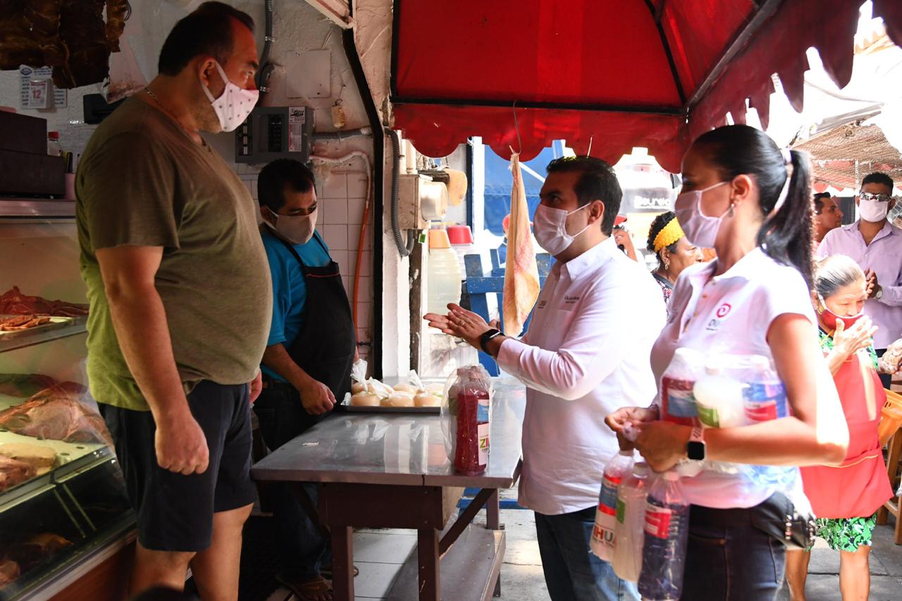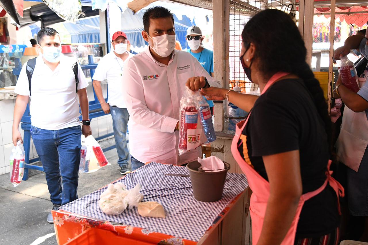 El presidente municipal Jorge Sánchez Allec junto a su esposa Lizette Tapia Castro hicieron entrega de kits de líquidos a locatarios del mercado municipal para mantener sus espacios en óptimas condiciones ante la contingencia Covid-19, siendo una de las principales medidas sanitarias para evitar la propagación del Coronavirus.