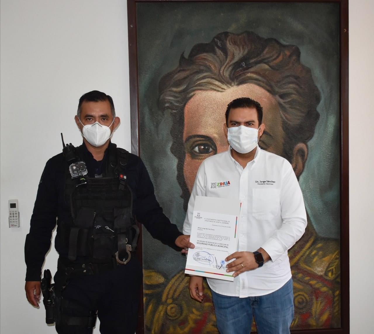 El Presidente municipal Jorge Sánchez Allec, hizo entrega del nombramiento de encargado de despacho de la Dirección de Seguridad Pública Municipal al oficial Jorge Berrios Flores, quien a partir de hoy estará al frente de esta área.