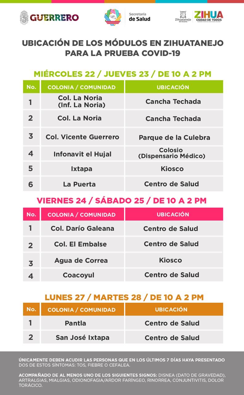 Derivado de la gestión ante el gobierno del estado que encabeza Héctor Astudillo Flores, el gobierno municipal que preside Jorge Sánchez Allec instaló en diferentes puntos de la ciudad los módulos de prueba para diagnosticar coronavirus. De acuerdo a los datos de Salud Municipal, cuyo titular es Onasis Pinzón Oregón, este miércoles en Zihuatanejo se realizaron 93 pruebas.