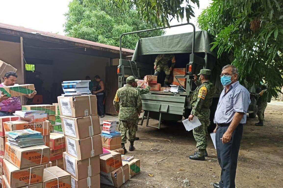 El Capitán primero de infantería, Oscar Emmanuel Bárrera López del 75 Batallón de Infantería con sede en Petatlán dio a conocer que está entrega forma parte del convenio Sedena, Semar, SEP y la Comisión Nacional de Libros de textos gratuitos para la distribución de los libros y materiales educativos para el ciclo escolar 2020-2021 con la finalidad de que los alumnos inicien con todas las herramientas básicas para su aprendizaje.