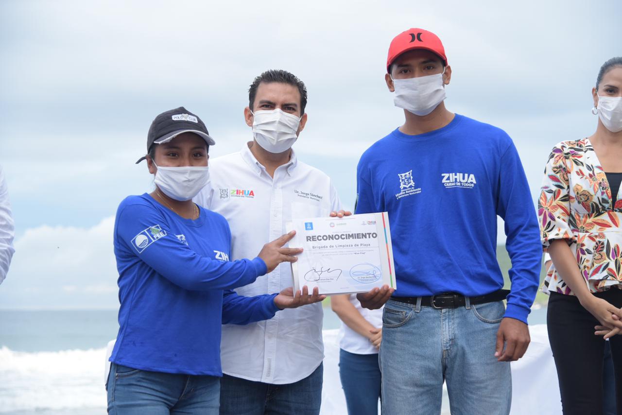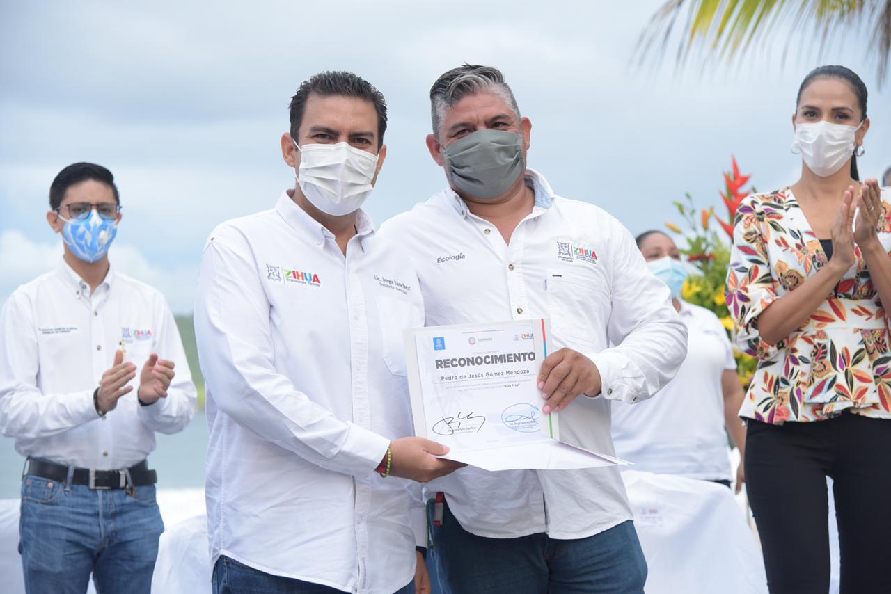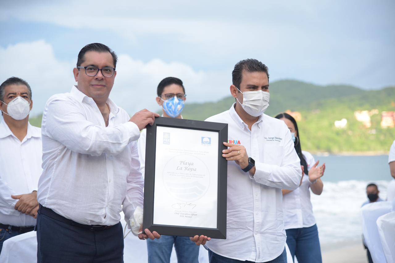 El presidente Jorge Sánchez Allec recibió de Joaquín Arturo Díaz Ríos, Director Ejecutivo de la Fundación para la Educación Ambiental (FFE) México, el distintivo Blue Flag que acredita a Playa La Ropa y el Palmar IIl como playas certificadas, así como la renovación de Palmar I y II, manteniendo así a Ixtapa Zihuatanejo como uno de los destinos con las mejores playas de toda la república y del mundo.