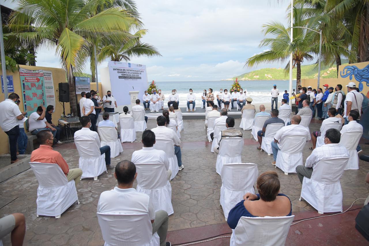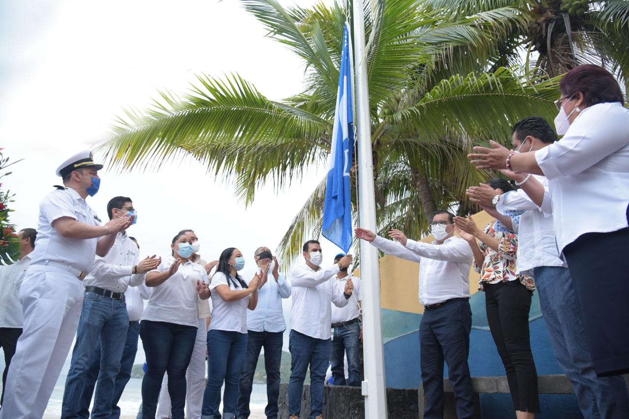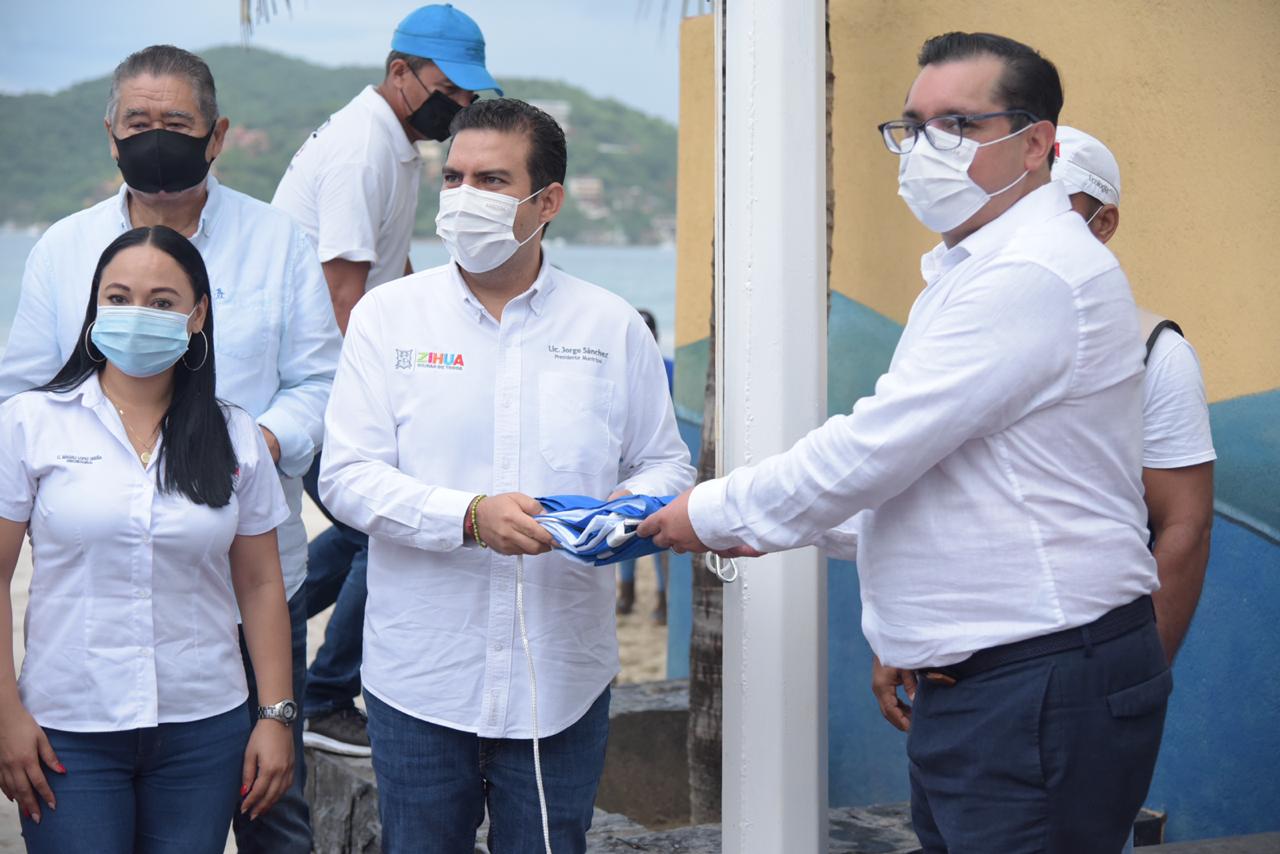 El presidente Jorge Sánchez Allec recibió de Joaquín Arturo Díaz Ríos, Director Ejecutivo de la Fundación para la Educación Ambiental (FFE) México, el distintivo Blue Flag que acredita a Playa La Ropa y el Palmar IIl como playas certificadas, así como la renovación de Palmar I y II, manteniendo así a Ixtapa Zihuatanejo como uno de los destinos con las mejores playas de toda la república y del mundo.