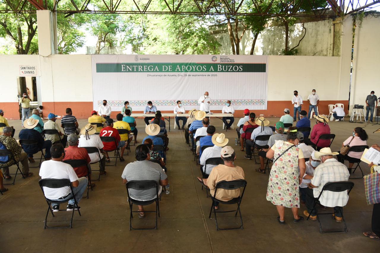 En su intervención Juan José Castro Justo, Secretario de Agricultura, Ganadería, Pesca y Desarrollo Rural. (SAGADEGRO) del gobierno del estado, dijo que se beneficiaron más de 300 buzos de Costa Grande de los municipios de Zihuatanejo, La Unión y Petatlán.