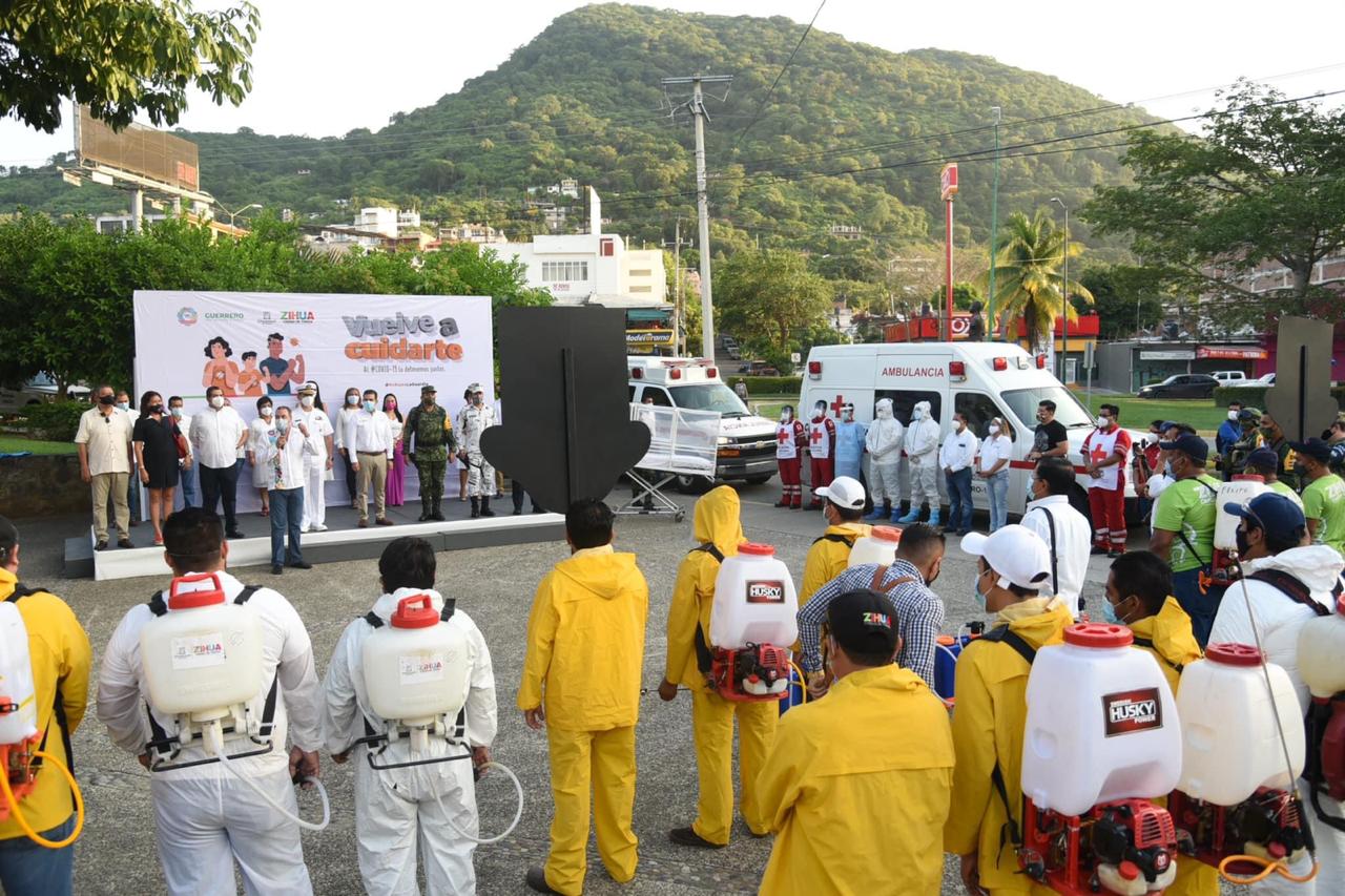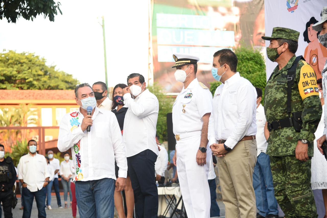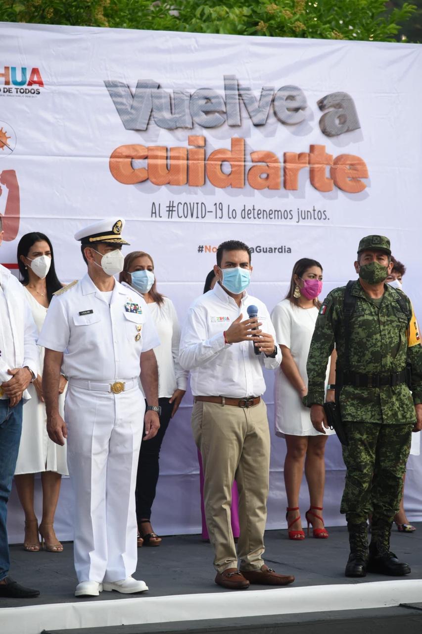 El presidente Jorge Sánchez Allec junto a autoridades militares y estatales, así como la Cruz Roja Mexicana, dio el banderazo de arranque de la Campaña “Vuelve a Cuidarte” contra el Covid-19, ratificando con ello el compromiso con los zihuatanejenses para disminuir los contagios de este virus.