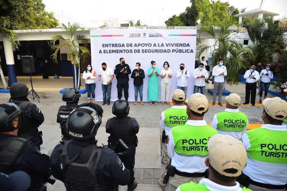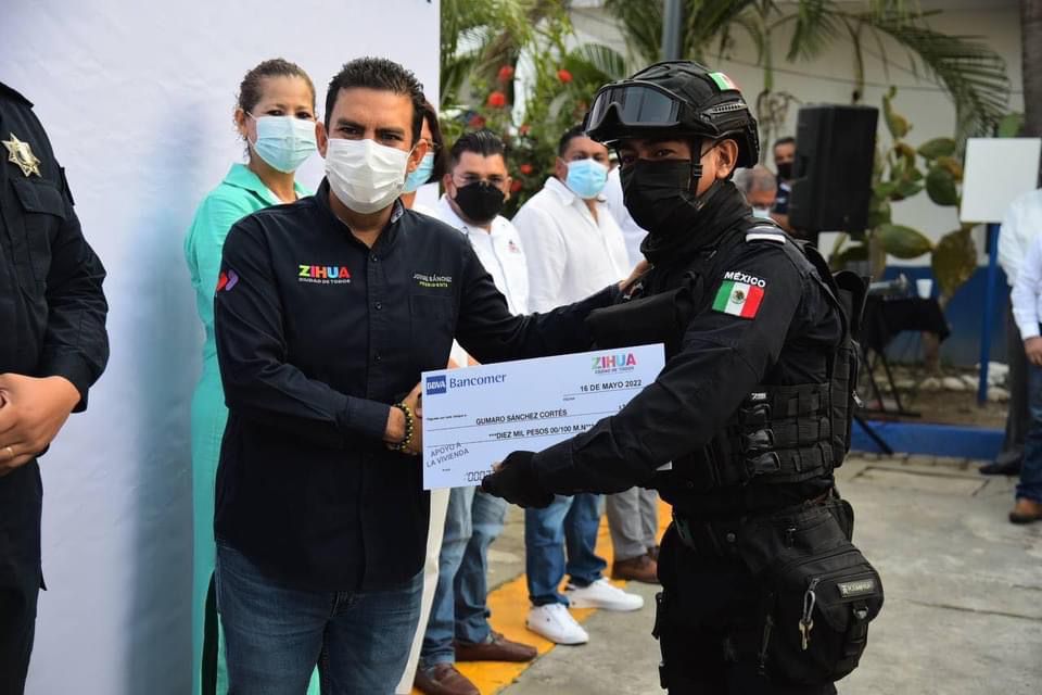 El presidente Jorge Sánchez Allec, acompañado de integrantes de la Comuna, se trasladó este lunes hasta las instalaciones de la dirección de Seguridad Púbica Municipal, donde encabezó la entrega de apoyos para vivienda a elementos de la Policía Preventiva, Unidad de Género y Policía Turística, una acción realizada con recursos propios del Ayuntamiento de Zihuatanejo de Azueta.