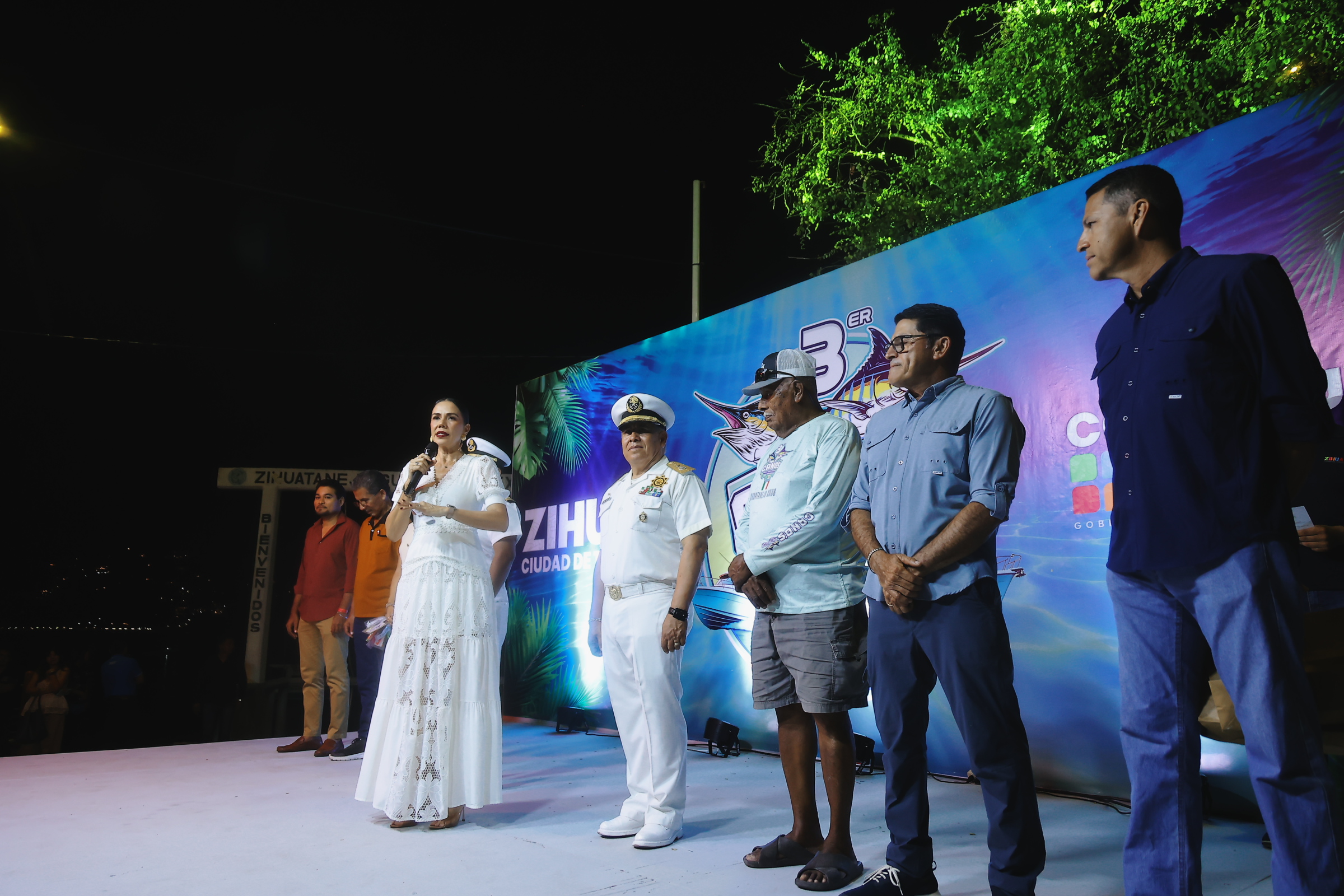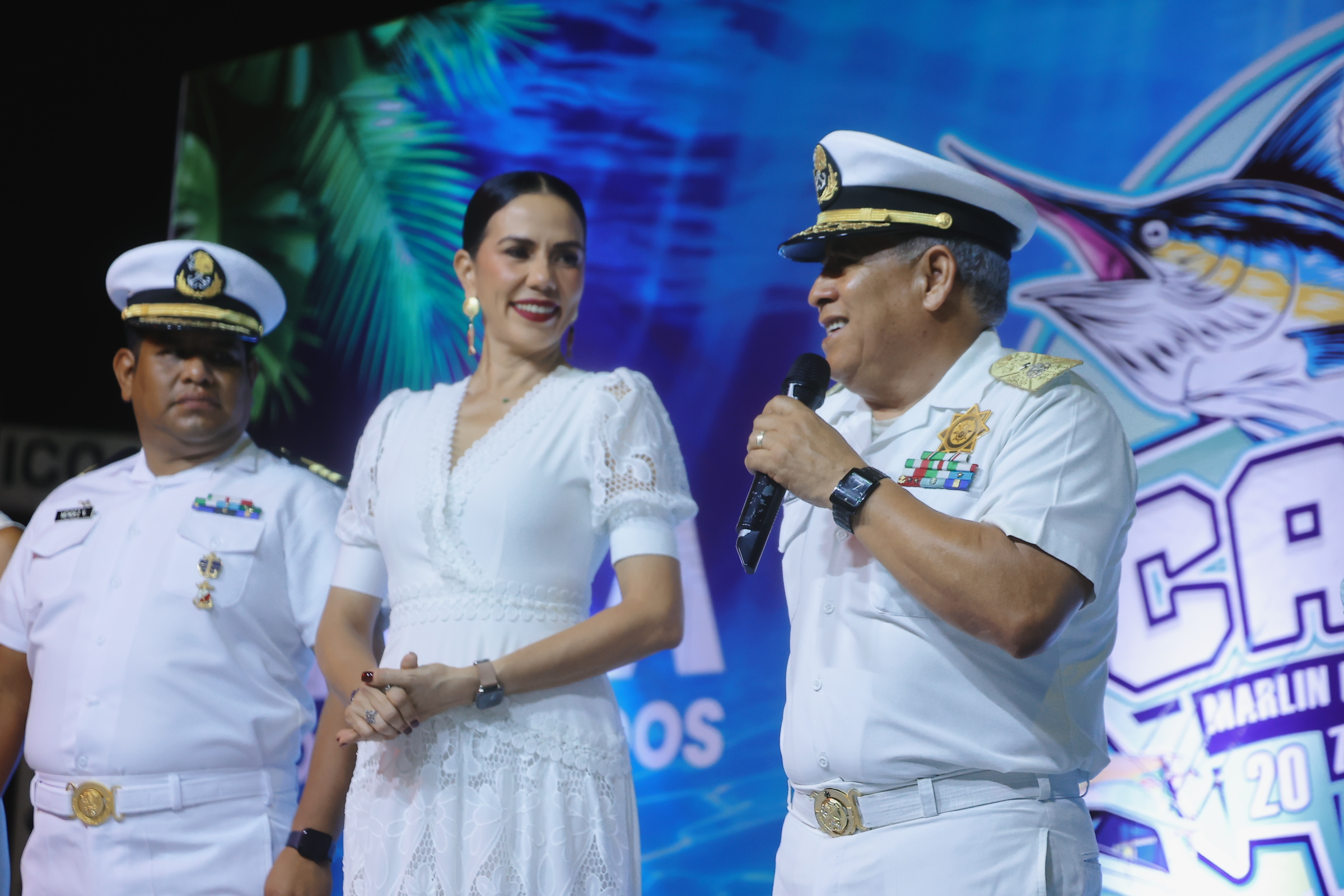 Dio la bienvenida a los participantes acompañada por el Vicealmirante Anselmo Osorio Fraga, Comandante de la Décima Octava Zona Naval, el Contraalmirante Javier Gallardo Pérez, titular de la Capitanía de Puerto, así como al Comité del Torneo de Pesca, encabezado por Víctor Cano, a quien reconocio por su compromiso y visión para impulsar este torneo.